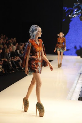In the end it was a marriage between the pre-announced technology and Alexander McQueen's apocalyptical vision of the future when we will all be submerged. We understood his theme Plato's Atlantis from the video visuals projected on a massive LED screen, which depicted a snake goddess of Raquel Zimmerman, slinking in and out between different species of snakes and later on playing the submerged water nymph. Then two giant tank-like video cameras roamed the catwalk stage giving us different video angles to see the clothes on the screen screen and alongside these two roving camera beasts, the women that will roam the earth as evolved sea creatures also slowly glided about (glide being the operative word as the shoes were killer with their 10 inch curved heels and hoof-like front).